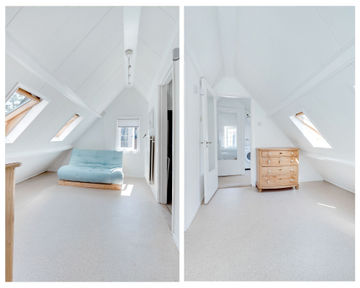 Tweede verdieping: de overloop verleent toegang tot een zeer royale (slaap)kamer met kastruimte en de laundry.