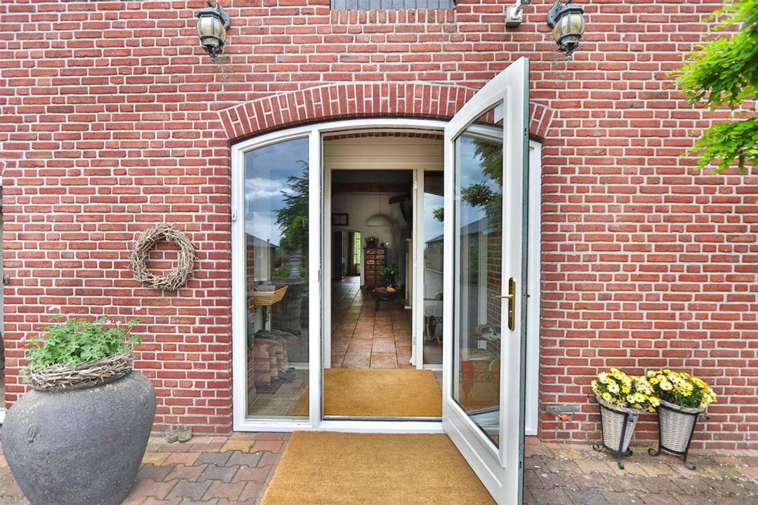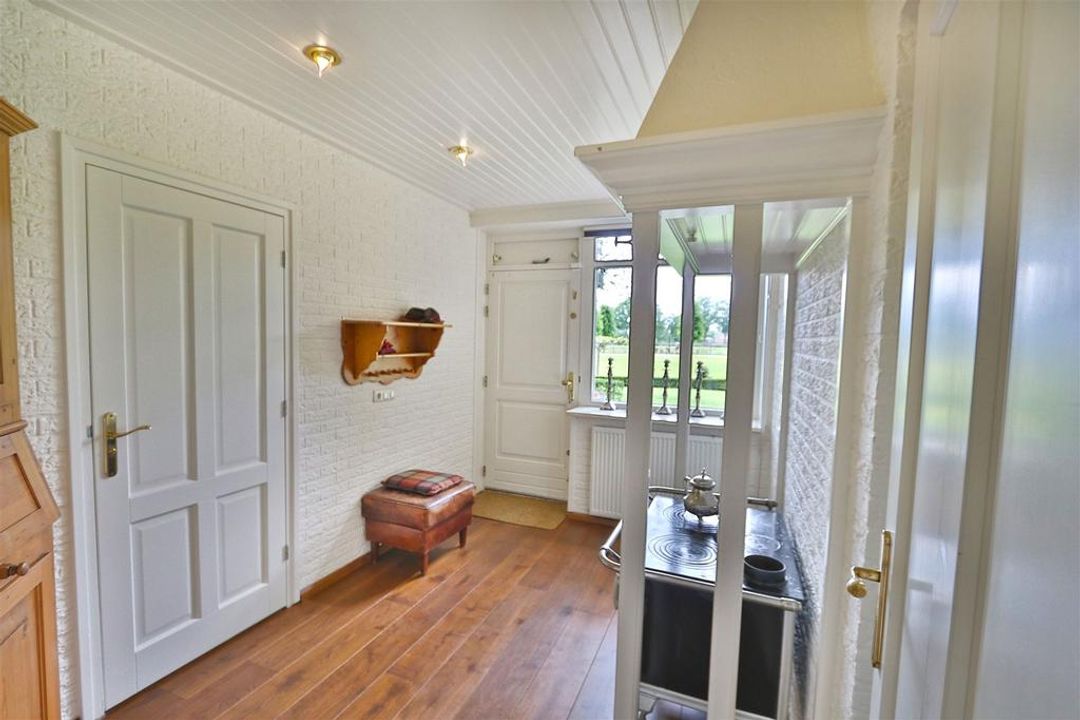 De voordeur van de woning bevindt zich aan de westzijde, via de voordeur is de entree te vinden die toegang biedt tot de zitkamer, toilet en kantoor. De entree, kantoorruimte en zitkamer zijn voorzien van een eikenhouten vloer. Vanuit de zitkamer is tevens de woonkeuken en living te bereiken. De zitkamer is voorzien van een houtkachel aangesloten op de cv. Vanuit de zitkamer is zicht op de voortuin. De landelijke woonkeuken(2006) is voorzien van een spoeleiland, gasfornuis, granietenwerkblad, stoomoven, koffiemachine(2019), afwasmachine, koelkast, combi-oven, afzuiging en bergruimte. In de keuken is een schuifpui aanwezig voor toegang naar het terras in de voortuin.