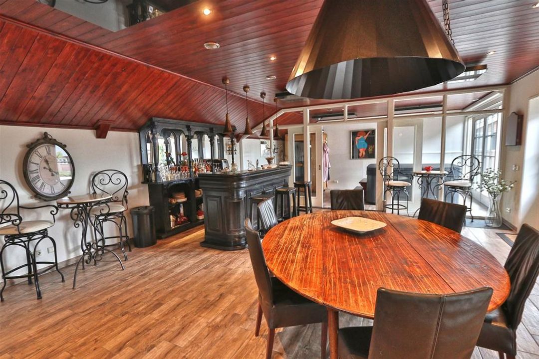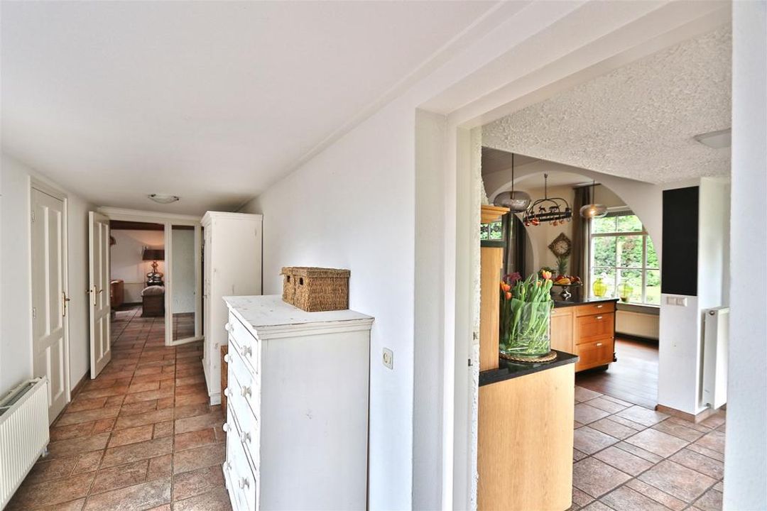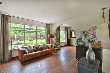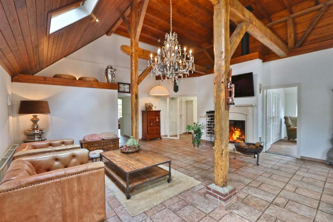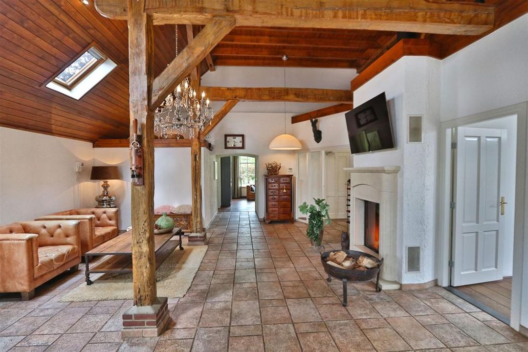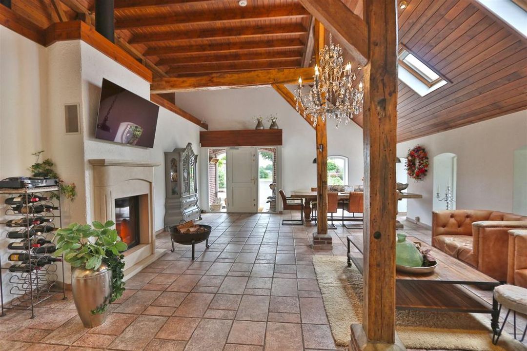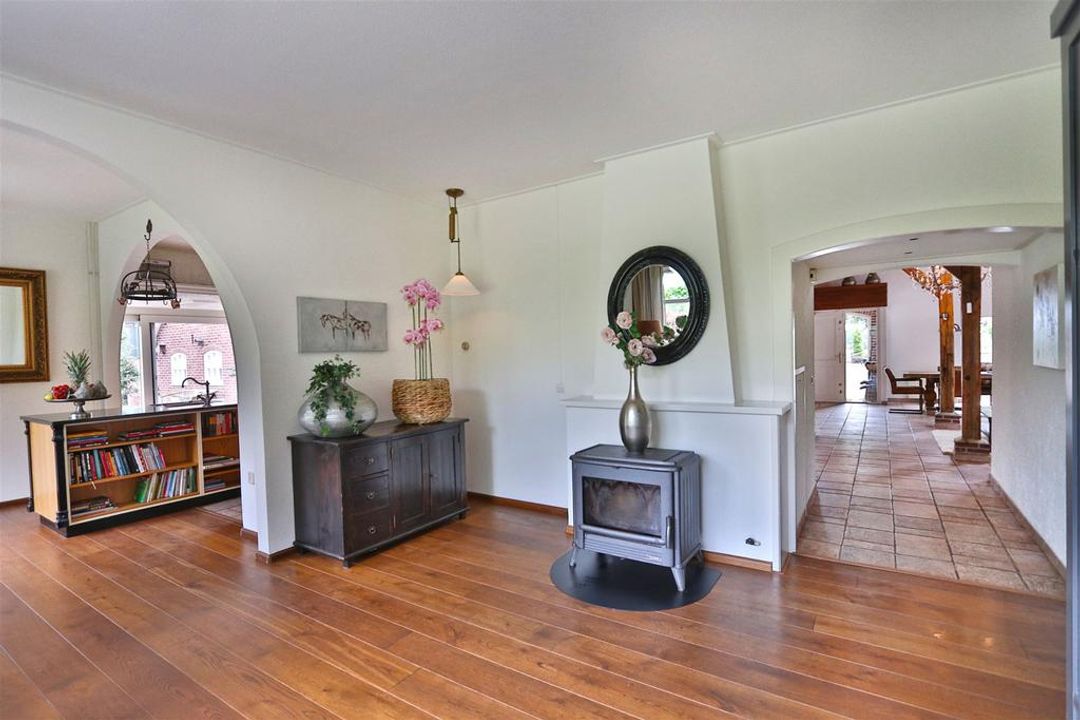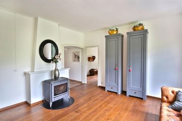 De sfeervolle riante living is voorzien van een houthaard met luchtcirculatiesysteem, tegelvloer en vestibule met buitendeur. In de woonkamer zijn authentieke elementen gebruikt en het hoge plafond, afgewerkt met houtdelen, geeft het geheel karakter. Vanuit de woonkamer is de gang en slaapkamer op begane grond te bereiken.