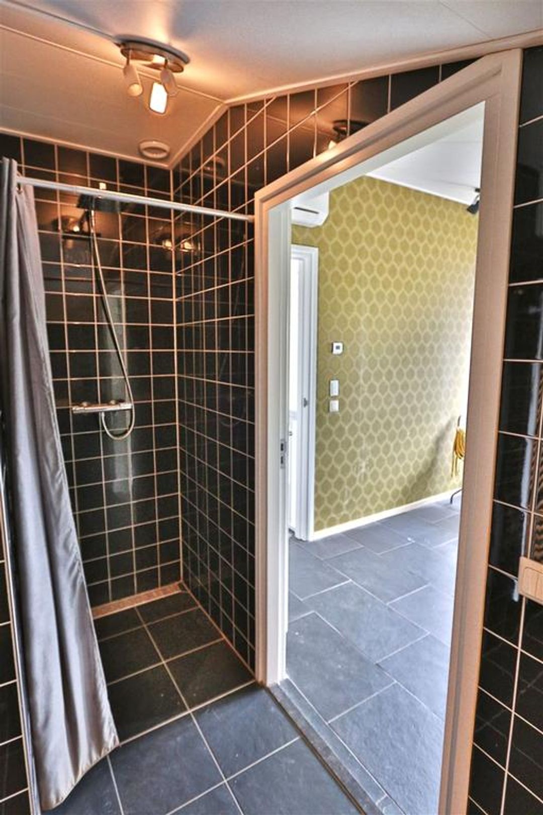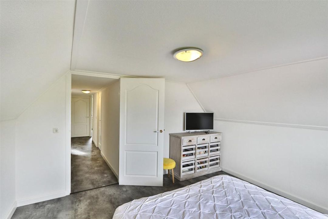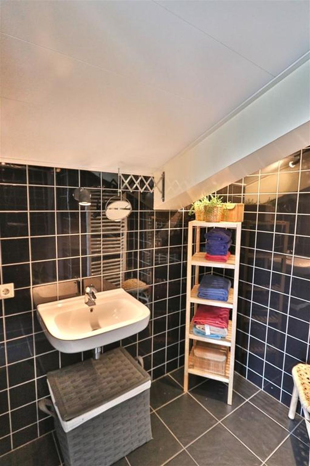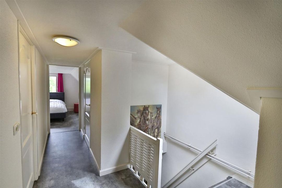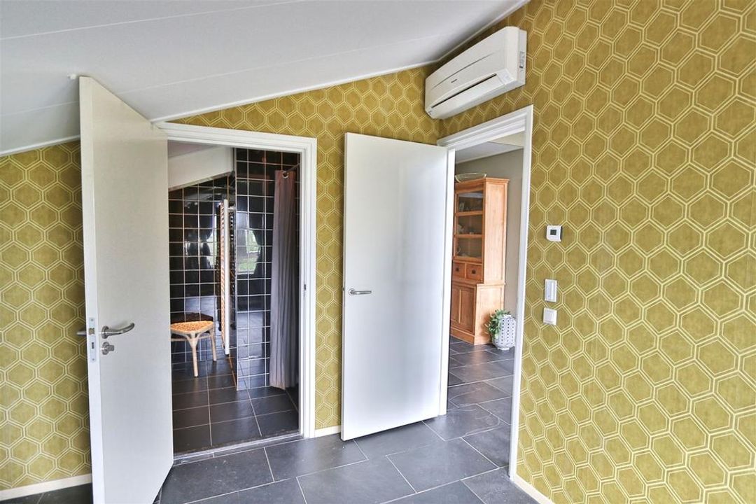 De slaapkamer op begane grond heeft een eikenhouten vloer en eigen badkamer voorzien van wastafelmeubel, toilet en douchecabine. Vanuit de badkamer is de gang te bereiken. Vanuit de gang is de vaste trap naar boven te vinden.