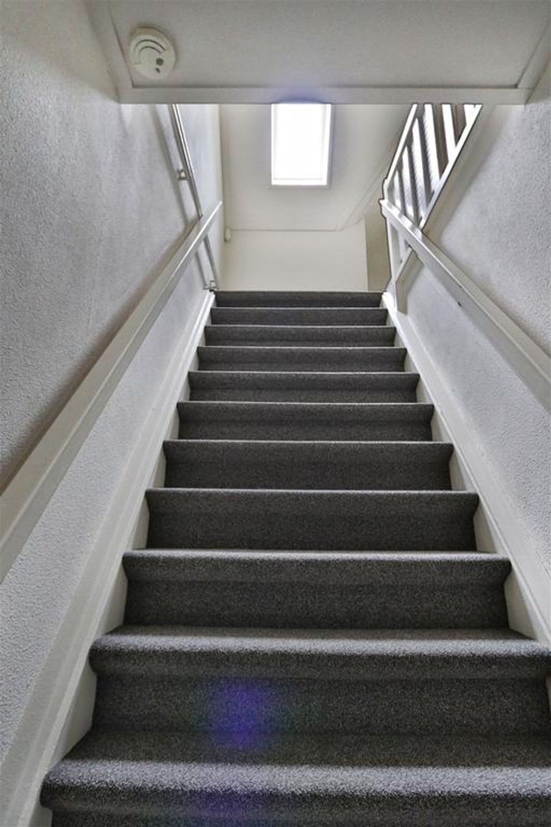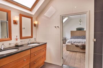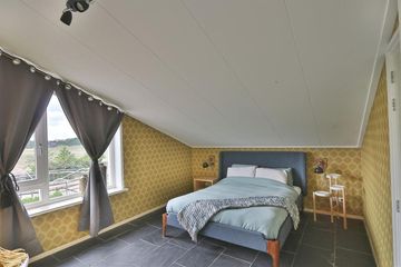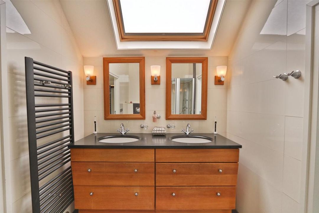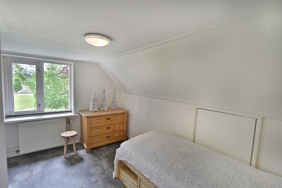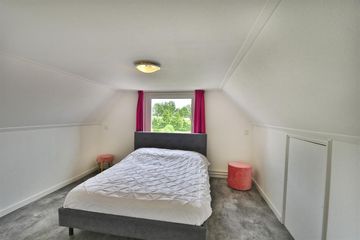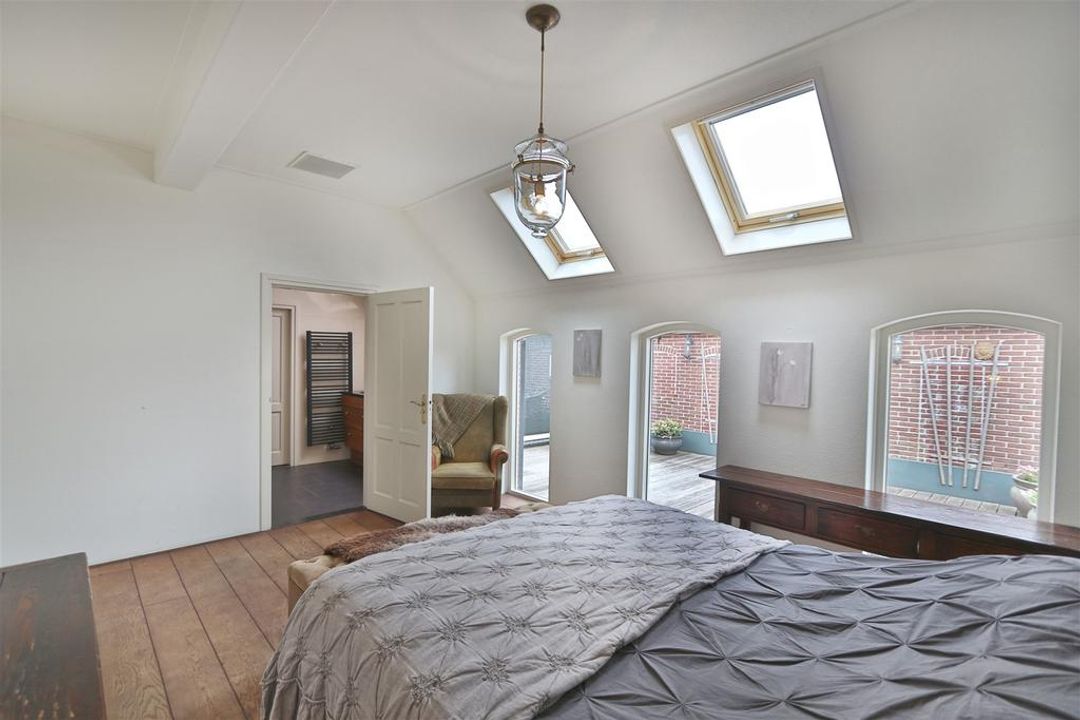 De slaapkamer op begane grond heeft een eikenhouten vloer en eigen badkamer voorzien van wastafelmeubel, toilet en douchecabine. Vanuit de badkamer is de gang te bereiken. Vanuit de gang is de vaste trap naar boven te vinden.