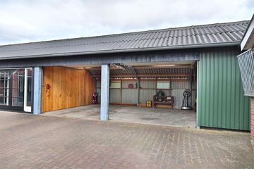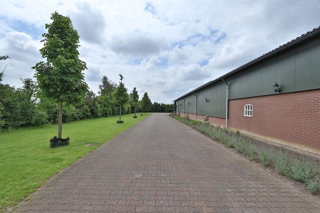 De paardenhouderij heeft een eigen opgang met elektrische poort. Rondom is voldoende parkeerruimte aanwezig voor trailers en vrachtwagens.