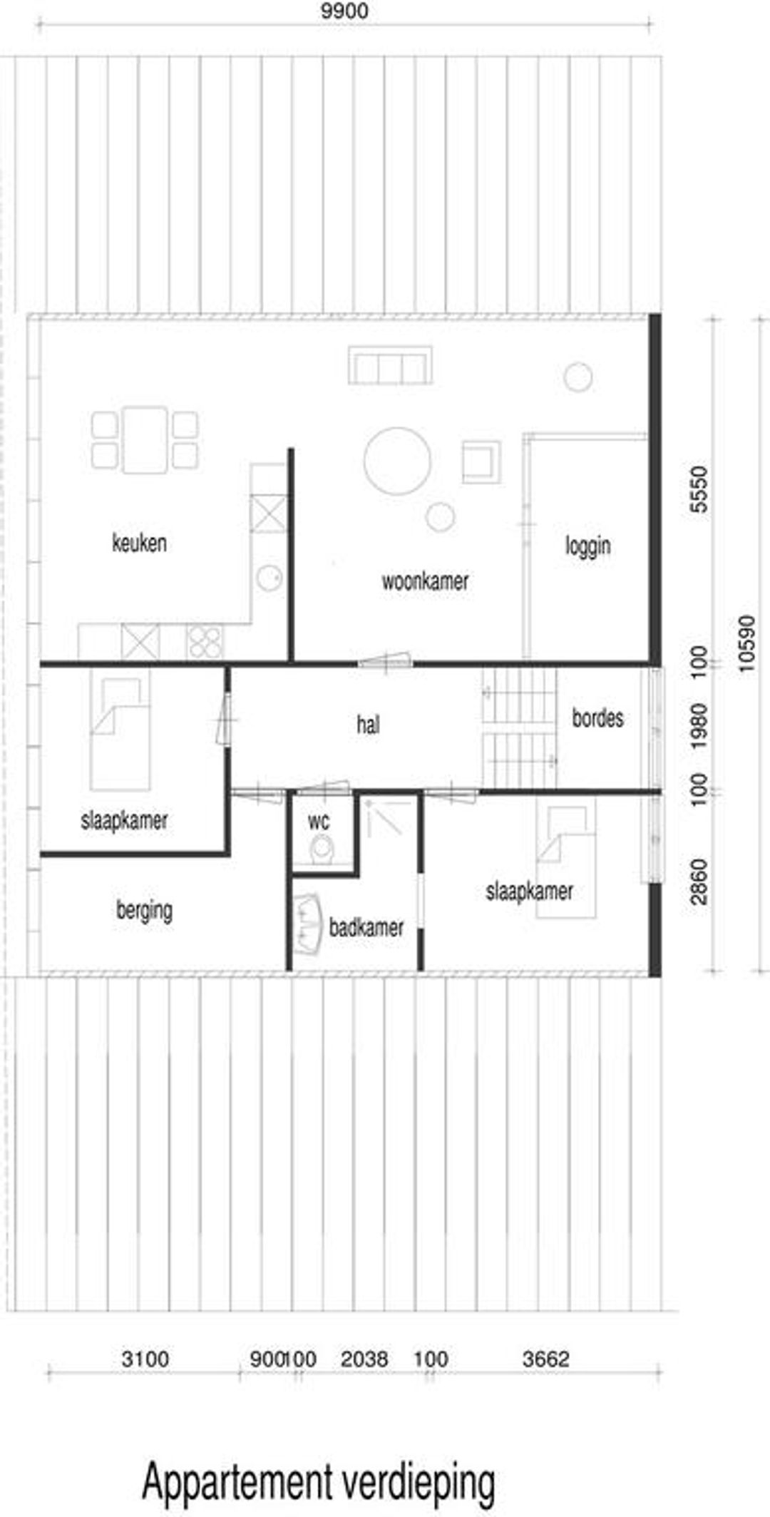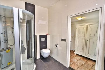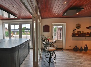 Het gastenverblijf op basis van logies is gesitueerd op de 1e verdieping van de binnenrijhal. Middels de centrale hal of eigen opgang is via een vaste trap de 1e verdieping te bereiken. Het verblijf is voorzien van 3 slaapkamers, badkamer, woonkamer met eetgedeelte, open keuken en balkon. Vanuit de slaapkamer is er uitzicht over de binnenrijhal en vanaf het balkon uitzicht over de weides. Het verblijf heeft een eigen cv. en is voorzien van vloerverwarming en airconditioning.