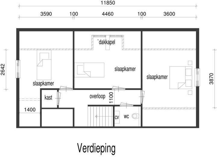 Op de eerste verdieping (houten vloer) zijn 3 slaapkamers, een berging en ruimte met toilet en wastafel aanwezig.